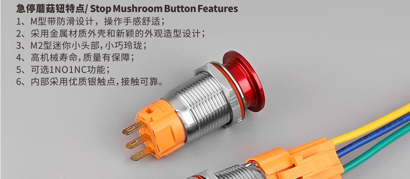 開孔16mm急停鈕,自鎖款;防塵/耐腐蝕/耐溫;開關觸點類型為:1NO1NC;